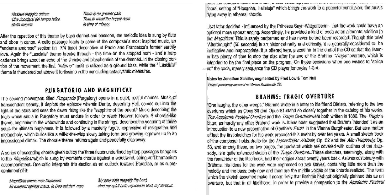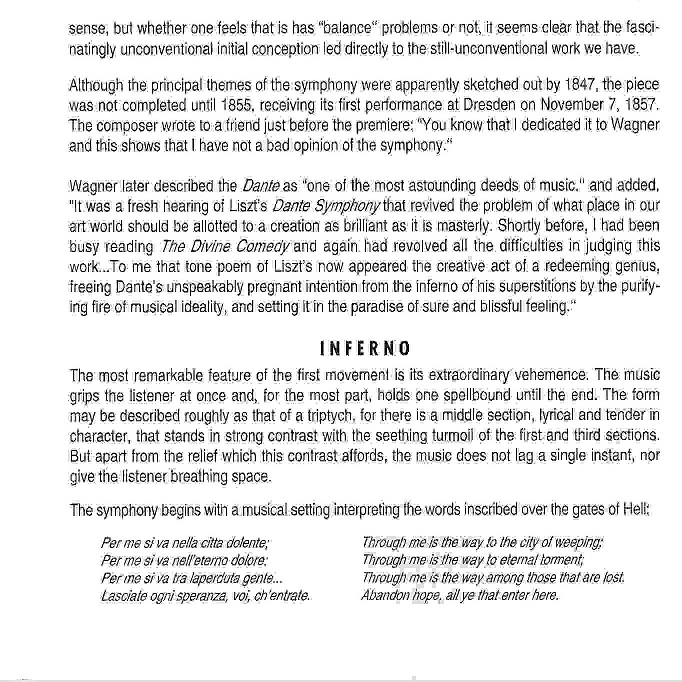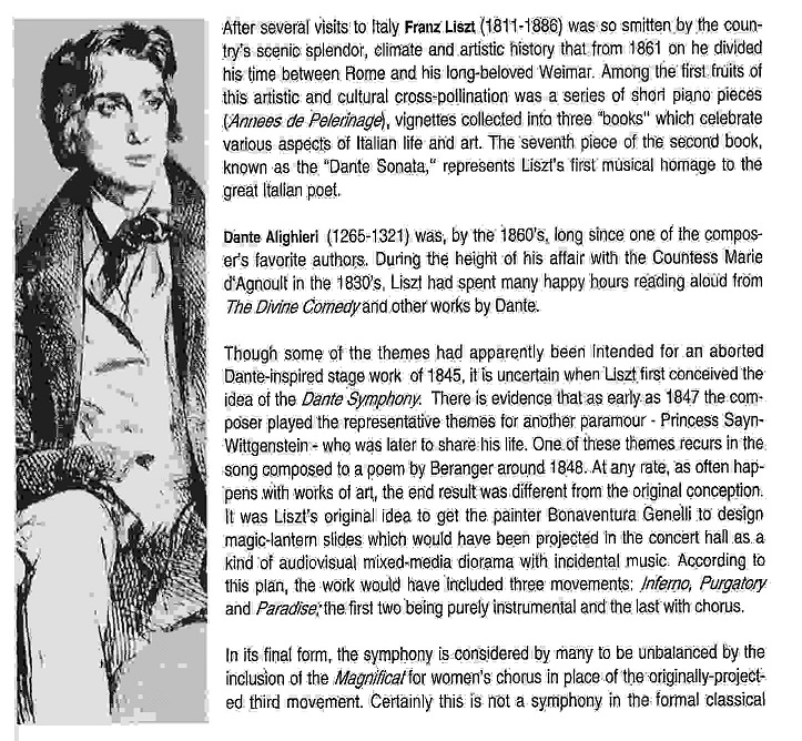 A Symphony to Dante’s Divine Comedy, S.109, or simply the “Dante Symphony“, is a choral symphony composed by Franz Liszt. Written in the high romantic style, it is based on Dante Alighieri‘s journey through Hell and Purgatory, as depicted in The Divine Comedy. It was premiered in Dresden in November 1857, with Liszt conducting himself, and was unofficially dedicated to the composer’s friend and future son-in-law Richard Wagner. The entire symphony takes approximately 50 minutes to perform. It premiered on 7 November 1857.[1]