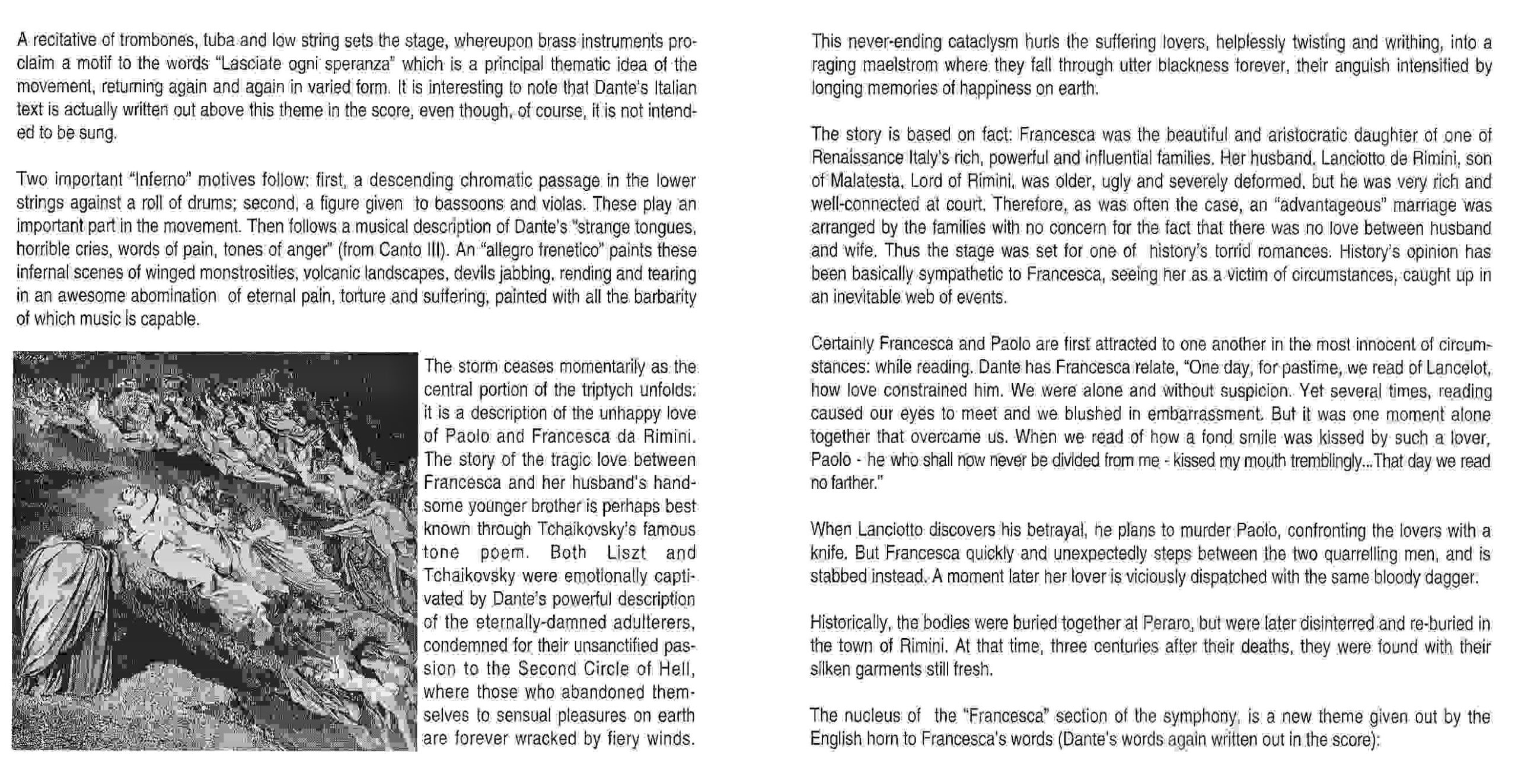 Some critics have argued that the Dante Symphony is not so much a symphony in the classical sense as it is two descriptive symphonic poems.[2] Regardless, Dante consists of two movements, both in a loosely structured ternary form with little use of thematic transformation.[3]