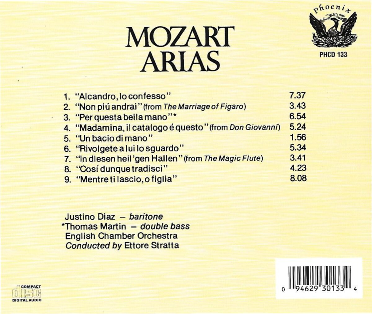 PHCD133 showcases the brilliant baritone Justino Díaz in a selection of Mozart’s most compelling concert and opera arias. Accompanied by the English Chamber Orchestra and conductor Ettore Stratta, Díaz brings technical mastery and expressive warmth to favorites such as Non più andrai, Madamina, and In diesen heil’gen Hallen. This recording offers a vibrant portrait of Mozart’s writing for the male voice and remains a standout in Díaz’s distinguished discography