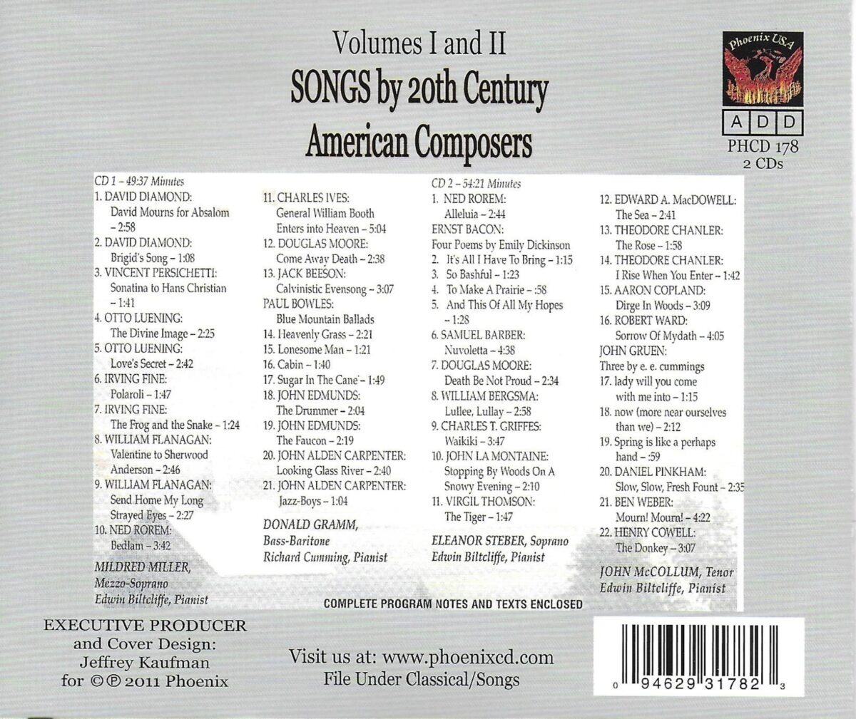 Volumes I and II contain 43 art songs by American composers sung by Mildred Miller, Donald Gramm, Eleanor Steber and John McCollum. Disc 1